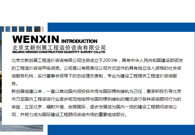 北京文新創(chuàng)展工程造價(jià)咨詢有限公司成立于2003年,是具有工程造價(jià)咨詢甲級(jí)資質(zhì)的股份制有限責(zé)任公司,目前業(yè)務(wù)穩(wěn)步發(fā)展。誠(chéng)邀各專業(yè)精英人才加盟公司,共同發(fā)展,并歡迎各界朋友開(kāi)展廣泛合作。
