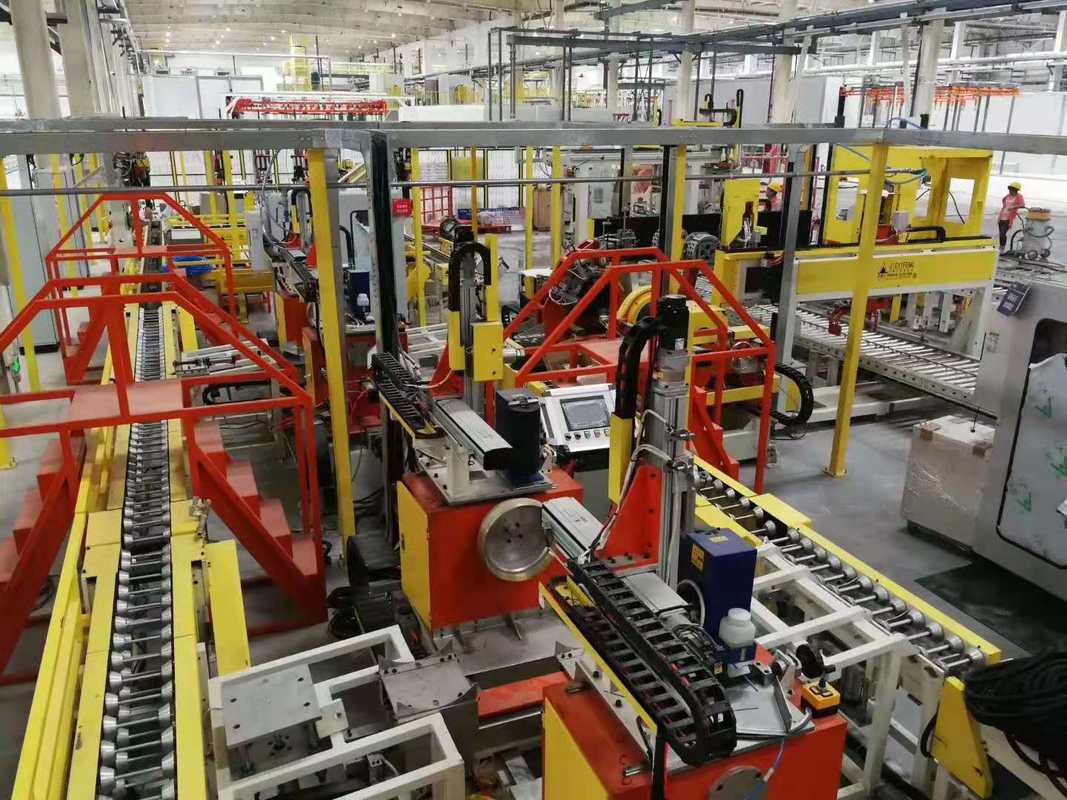 1、焊接自動(dòng)化生產(chǎn)線(xiàn)(由成型、上下料、組裝、搬運(yùn)、物流、工裝夾具和外置機(jī)器人及焊機(jī)組成);